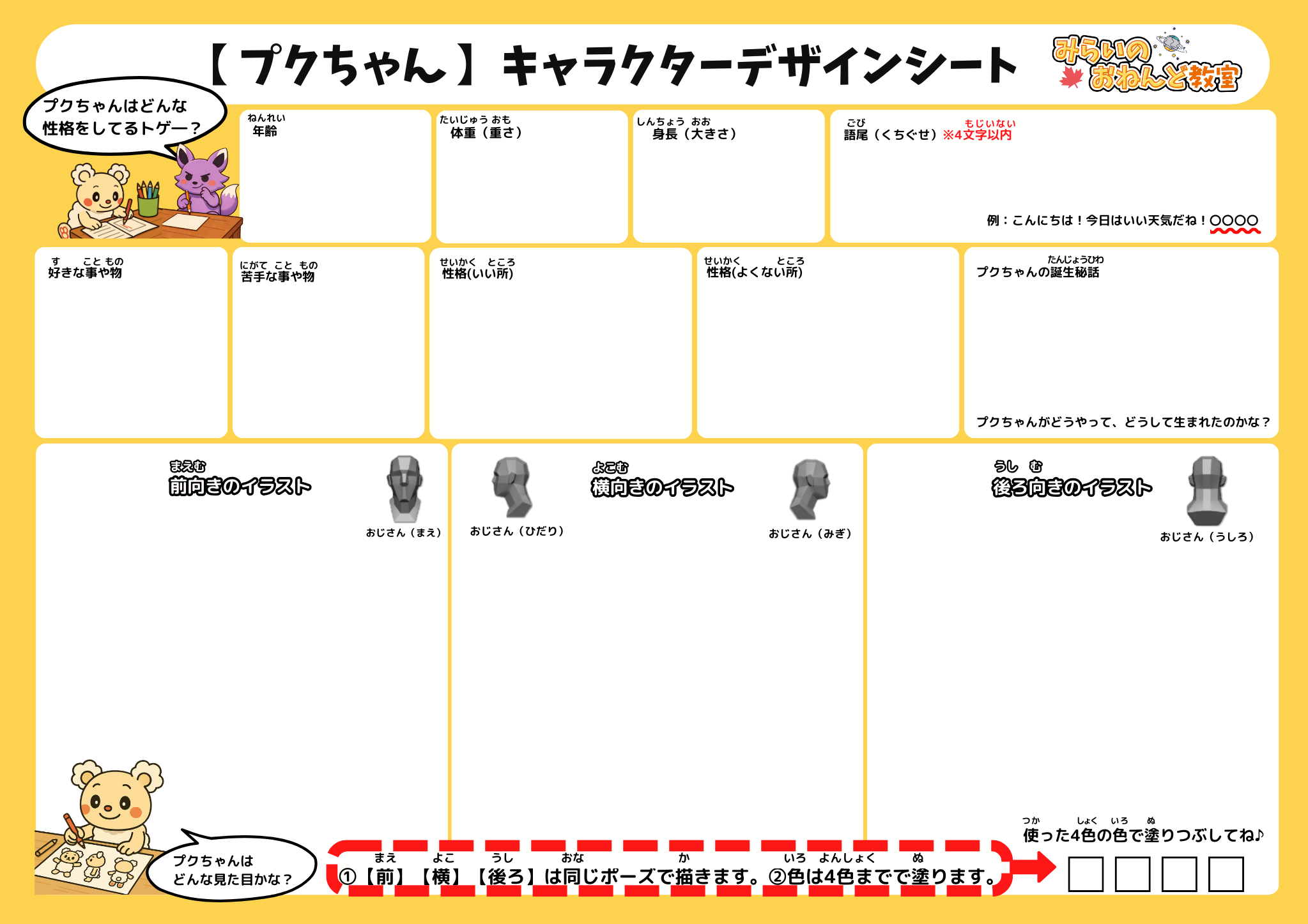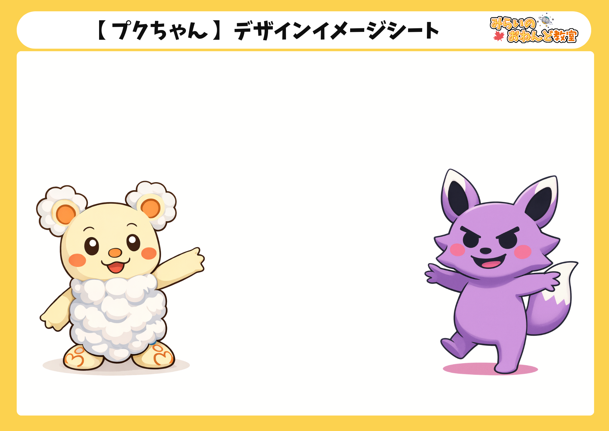 ※アナログイラスト・デジタルイラストのどちらでも構いません。 ※三面図(正面・横・うしろ)は、すべて同じポーズで統一してください。 ※必ず色塗りをお願い致します。ただし、色は4色までに限ります。 ※プクちゃんデザインシートとイメージシートの2枚を応募ください。 上記の条件が守られていない作品(例:色ぬりなし、三面図がバラバラのポーズ、色数超過など)は、審査対象外となります。 公平な審査を行うため、すべての応募者に共通のルールをお願いしております。 |